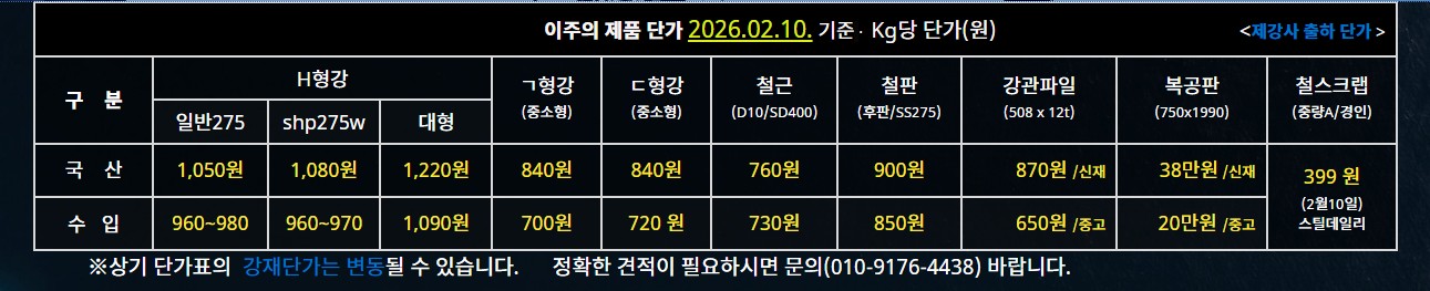 이주의 제품 단가 2026.02.10. 기준 · Kg당 단가(원) <제강사 출하 단가 > | ||||||||||