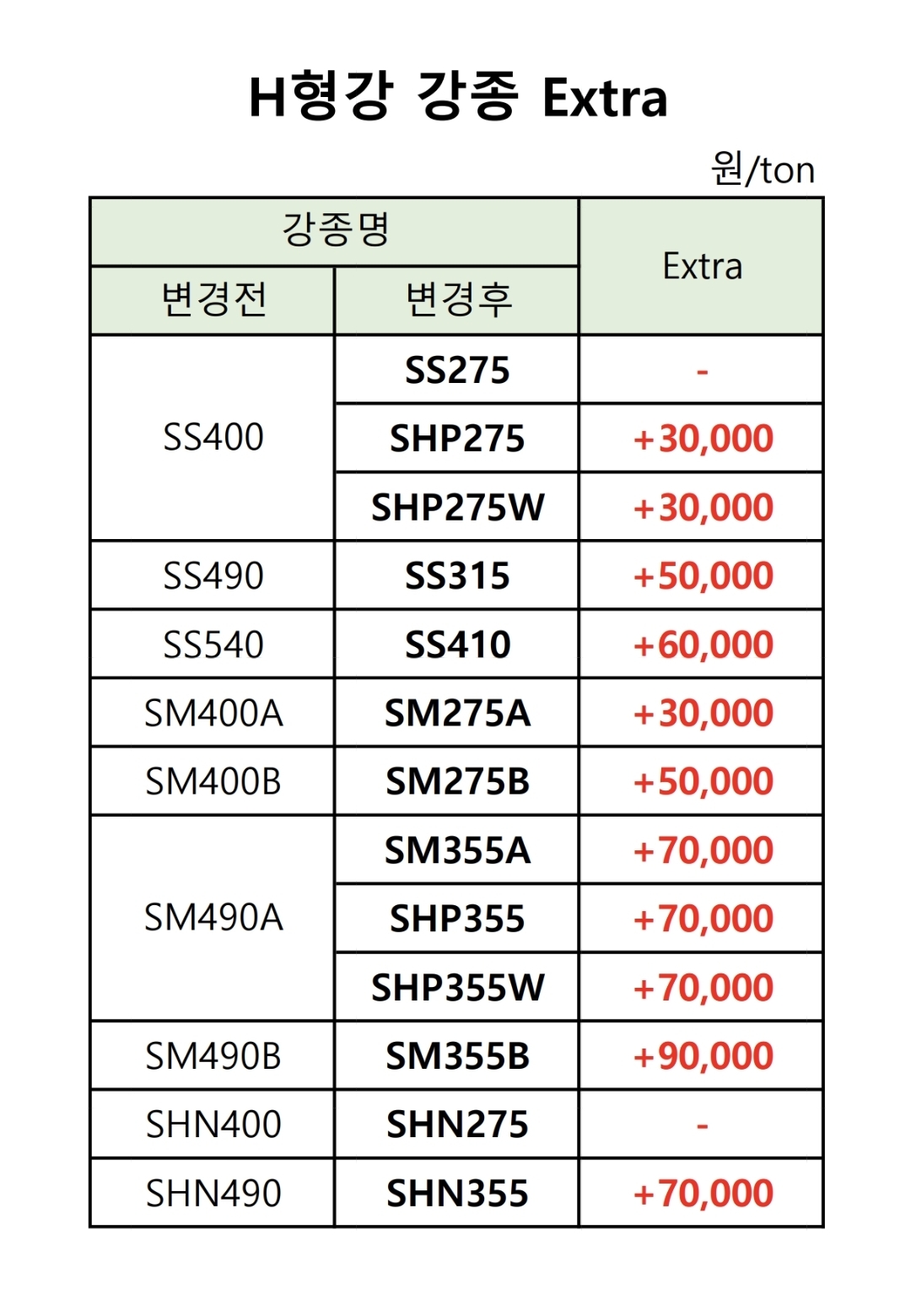 H형강 SM355, SHP355, SHN355, SHP355W, SHN355W 강종 비교표